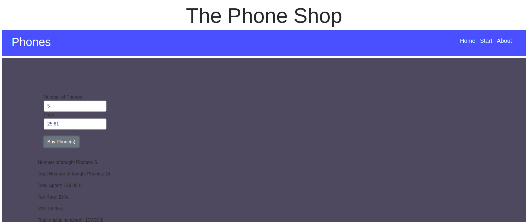 A small application that simulates the shopping of phones on a website. The user can choose how many phones to buy and one same price for all the phones. After submitting it, the user sees the number of bought phones and the shopping history. This includes also a tax rate of 23%. Finally, there's the account balance which is how much is left after each shop.